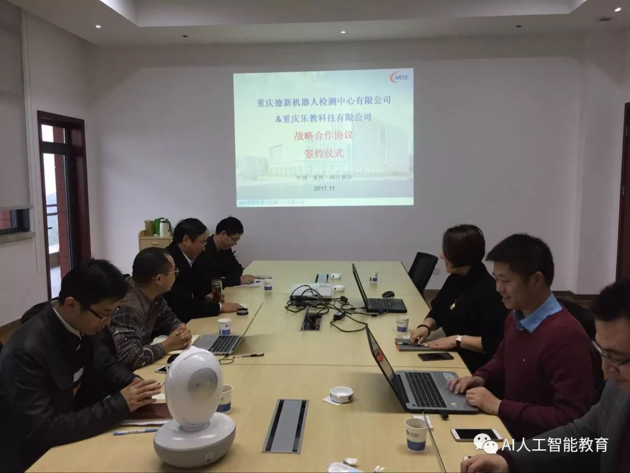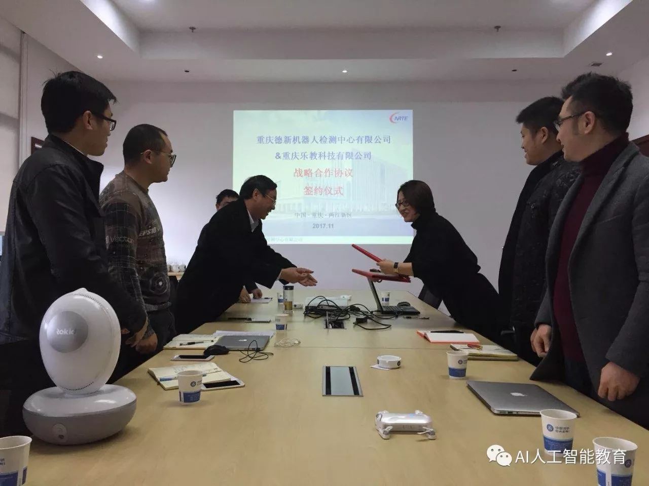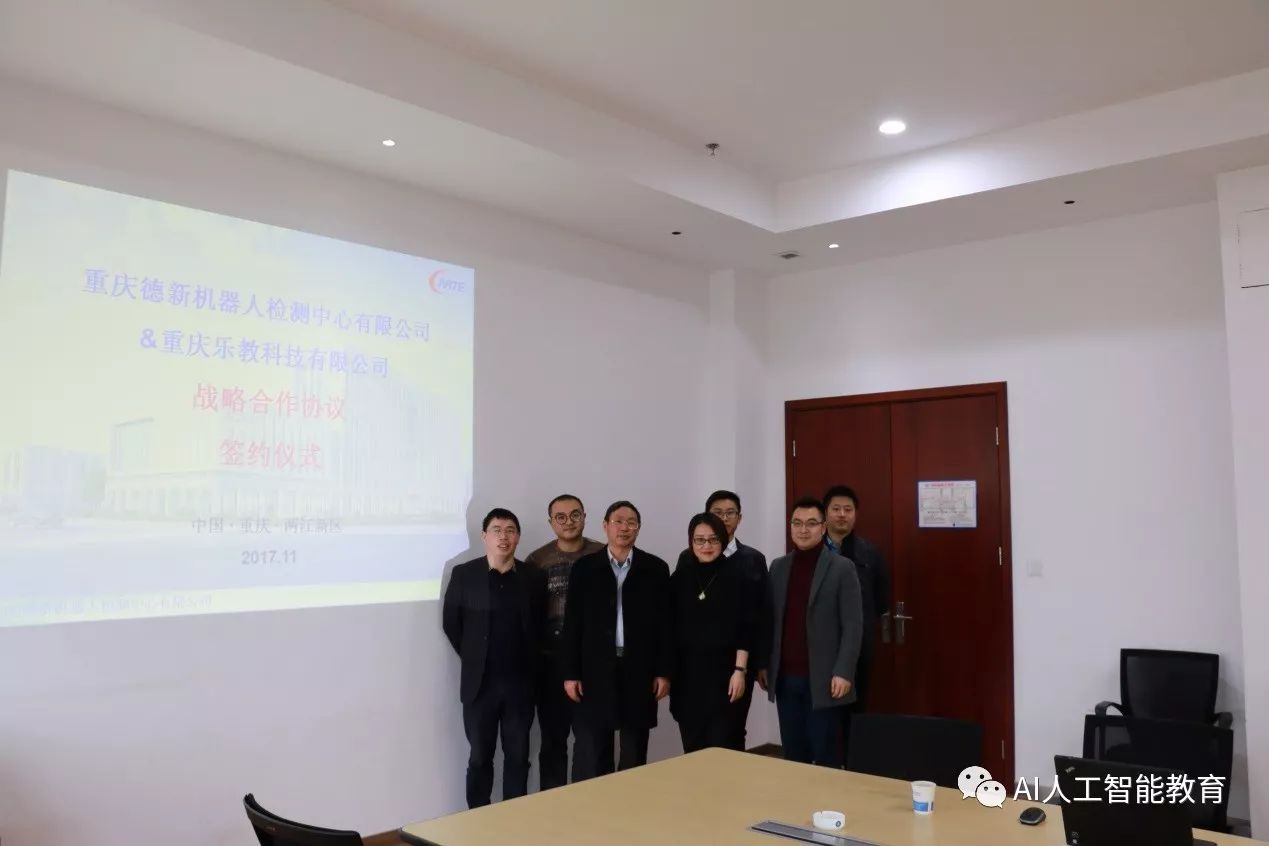 本次签约仪式在重庆德新机器人检测中心有限公司举行,出席会议的有德新公司欧家福总经理、零部件检测部袁强部长、环境检测部黄武凯部长、研发中心刘飞主任、服务机器人检测部彭鹏部长、服务机器人检测部王雨琴工程师等领导,乐教科技CEO张佳、副总经理张可、副总经理林科等领导,出席签约仪式。