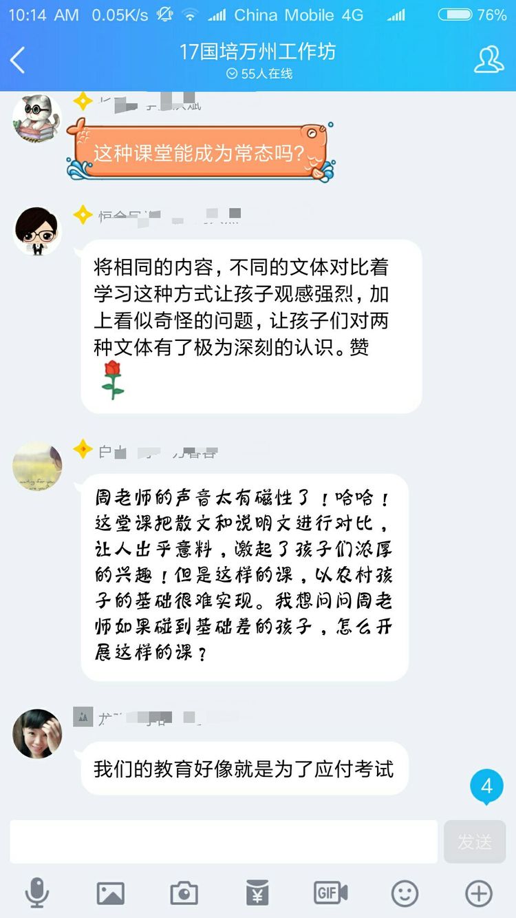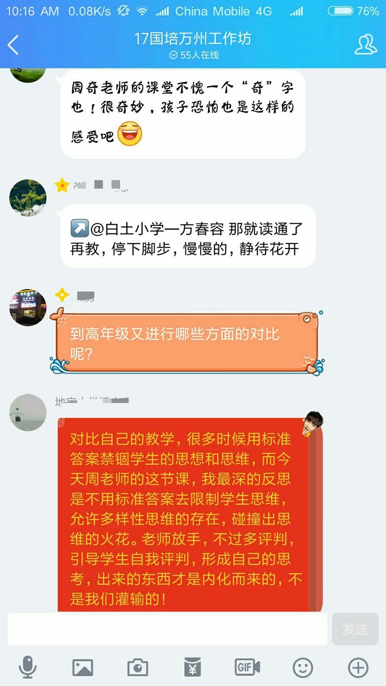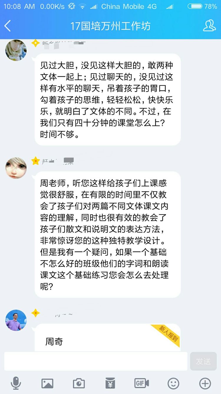 当然不是啦,认真参加培训的老师们怎么舍得玩手机呢。其实是周奇老师让大家对现场教学进行点评,让每一位老师将点评文字发在QQ群里,然后对参训老师一一解答疑问。以下分享老师们的点评