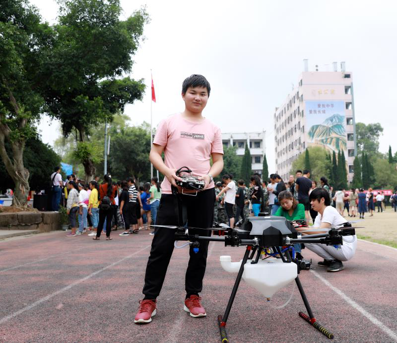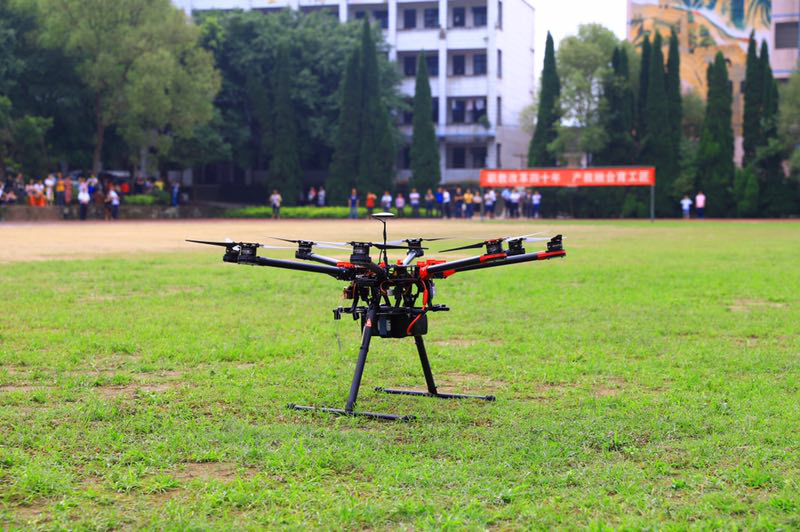 在动态部分,工作人员对组装好的几种无人机进行了仔细的检测和调试,并对零创GY-1植保无人机模拟植保作业和特色以及行业无人机的机型和特点进行了详细的介绍,在同学们的热情期盼下,完成了最终的试飞。