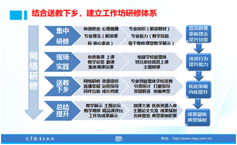 3. 结合送教下乡,建立工作坊研修体系--网络研修、集中研修、现场实践和送教下乡相结合。