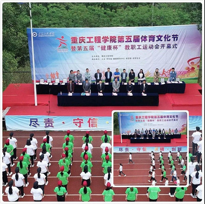 2019年4月11日上午,重庆工程学院操场内彩旗招展,鼓乐喧天,花团锦簇,人头攒动。6000余名师生迎着春日的朝阳,踏着春天的节拍,迎来了学校第五界体育文化节暨第五届“健康杯”教职工运动会,现场气氛热烈!多姿多彩!