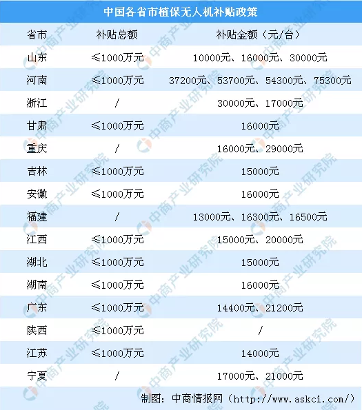 目前,进入补贴试点的省市已有浙江、安徽、江西、湖南、广东、重庆、吉林、福建、甘肃、江苏等十余个省市。在整体试点资金安排上,基本为千万元量级。政策支持下植保无人机市场在全国就进入快速发展期。