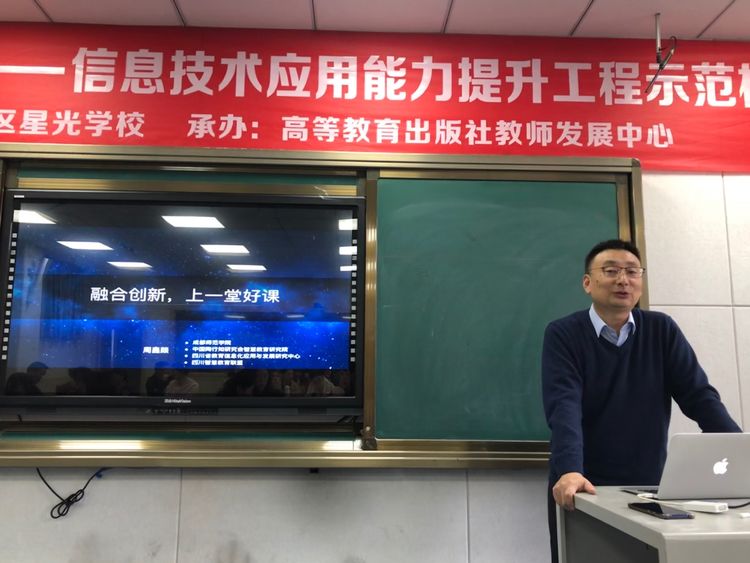 接着成都师范学院网络与信息中心主任周鑫燚教授以“融合创新,上好一堂课”为主题,对老师们进行了培训。周教授让我们明白作为一个新时代的教师,我们应该形成工具意识,利用工具提高我们的课堂效率,但工具不能留于表面,要真正的融合进我们的课堂,自然而然的作用于我们的课堂。
