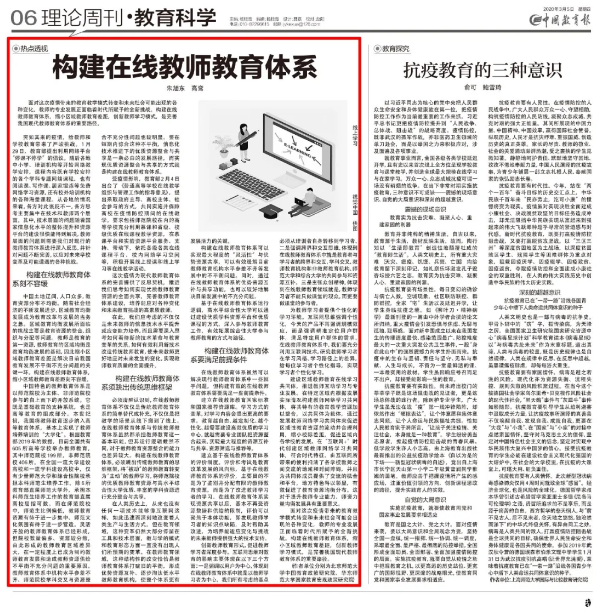 中国教育政策研究院常务副院长朱旭东、国家教育宏观政策研究院副研究员高鸾撰写了《构建在线教师教育体系》一文,阐述了我国构建在线教师教育体系的必要性、紧迫性,在线教师教育体系与传统教师教育体系的差异以及构建思路。文章刊发于《中国教育报》(2020年3月5日06版)