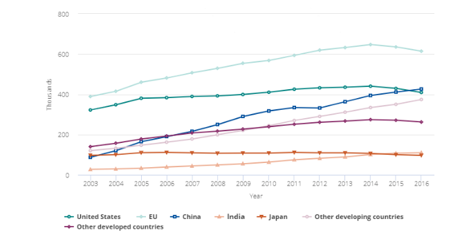 图一是STEM教育在不同的国家的发展折线图。我们看到桔红的线和深蓝色的线,向上走的都是像中国以及印度这样一些国家,那么我们可以看到根据教育的研究,这些国家他们都是目前发展非常快的国家,他们非常关注STEM的发展。