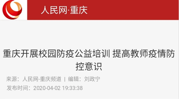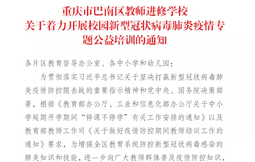 为进一步向广大教师群体普及疫情防控知识,提高防范意识,掌握疫情防控技能,重庆市中小学教师发展中心携手高教社教师发展中心,面向重庆市广大中小学幼儿园教职工开展校园防控新型冠状病毒肺炎疫情专题公益培训。