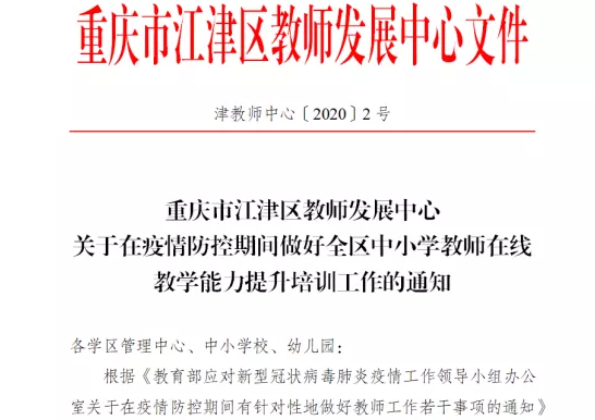 江津区教师发展中心下发《关于在疫情防控期间做好全区中小学教师在线教学能力提升培训工作的通知(津教师中心〔2020〕2号)》,强调各单位要充分利用“国培计划”学习平台,积极引导、鼓励教师充分利用网络平台免费开放共享的优质教师培训课程,自主选学,开展线上自主研修。区内63所学校1069名教师参与到了此次培训中。