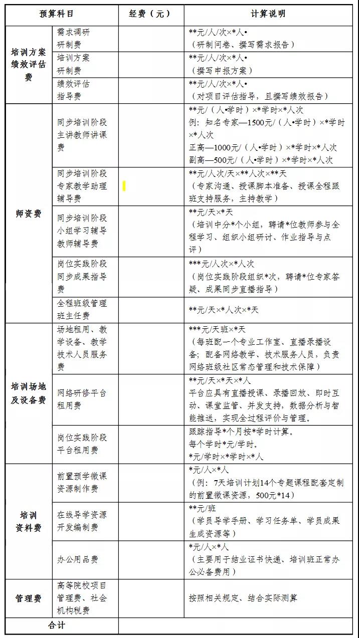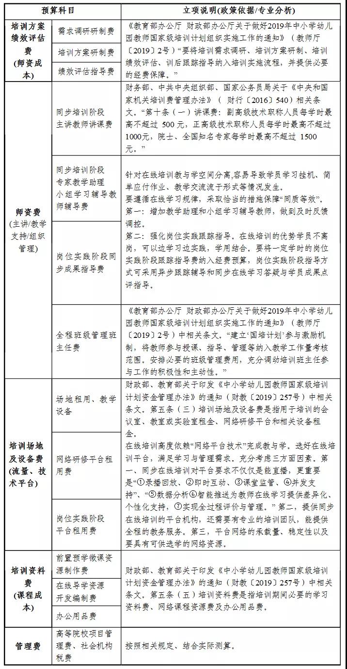 各省要依据教育部教师工作司、财务司关于印发《中小学幼儿园教师在线培训实施指南》的通知要求“经费成本包括师资成本、课程使用成本、流量成本、技术平台成本、学习支持成本、组织管理成本、管理费(税费)成本等”。